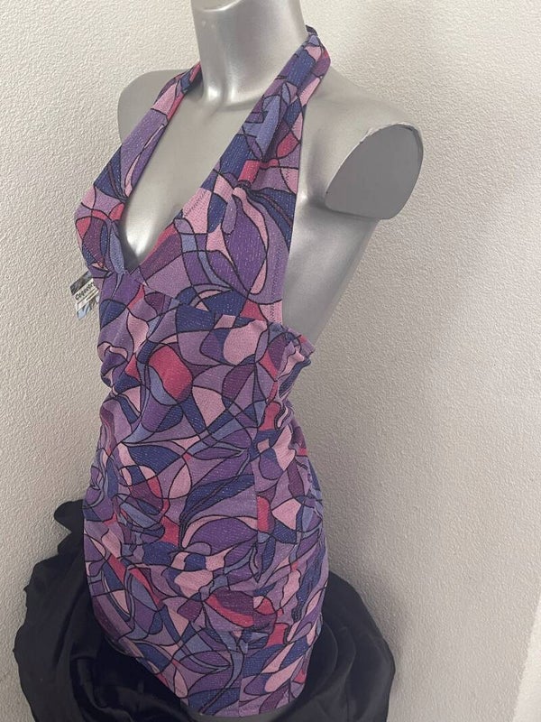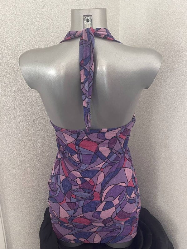 Feestelijk cocktail jurkje, haltermodel. Het jurkje valt boven de knie. Mooi meerkleurige print met goud doorweven draad.